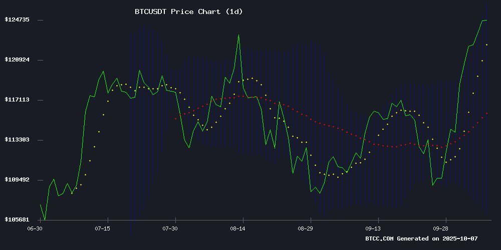 根据BTCC交易平台数据,截至2025年10月7日,BTC/USDT报价124,848.51美元,较20日均线116,355.80美元呈现明显多头排列。日线级别MACD指标金叉后持续发散,显示上涨动能充沛。关键阻力位126,370.40美元已被有效突破,这为后续上涨打开了空间。