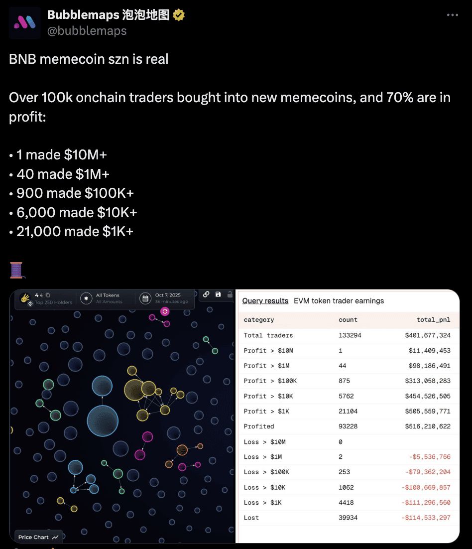 4. 超过 10 万名交易者加入趋势:Bubblemaps 报告称,超过 10 万名链上交易者参与了早期的 BNB 迷因交易,其中约 70% 的钱包在初始阶段获利,有几个地址实现了数百万美元的收益。