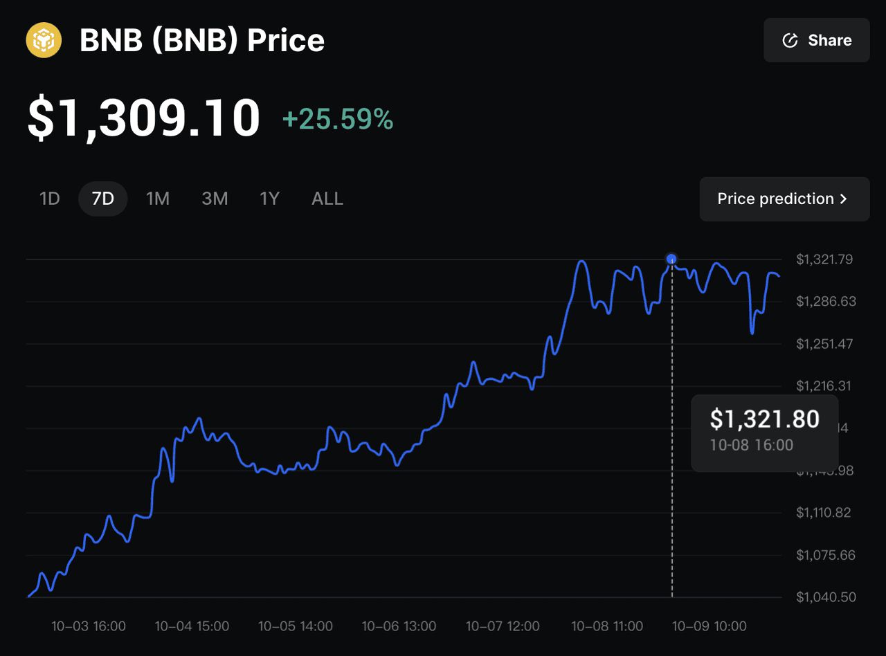最近的迷因币活动恰逢 BNB Chain 的强劲市场表现。根据 BingX 数据,2025 年 10 月 8 日,BNB 达到 1326.3 美元的历史新高,当日收盘价为 1321.8 美元。该代币在过去一个月内上涨了 48.71%,日交易量超过 61 亿美元,市值超过 1,750 亿美元。