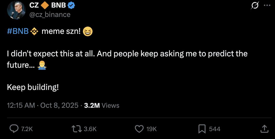 CZ 发推文谈及 BNB 迷因季 | 来源:CZ X(Twitter)