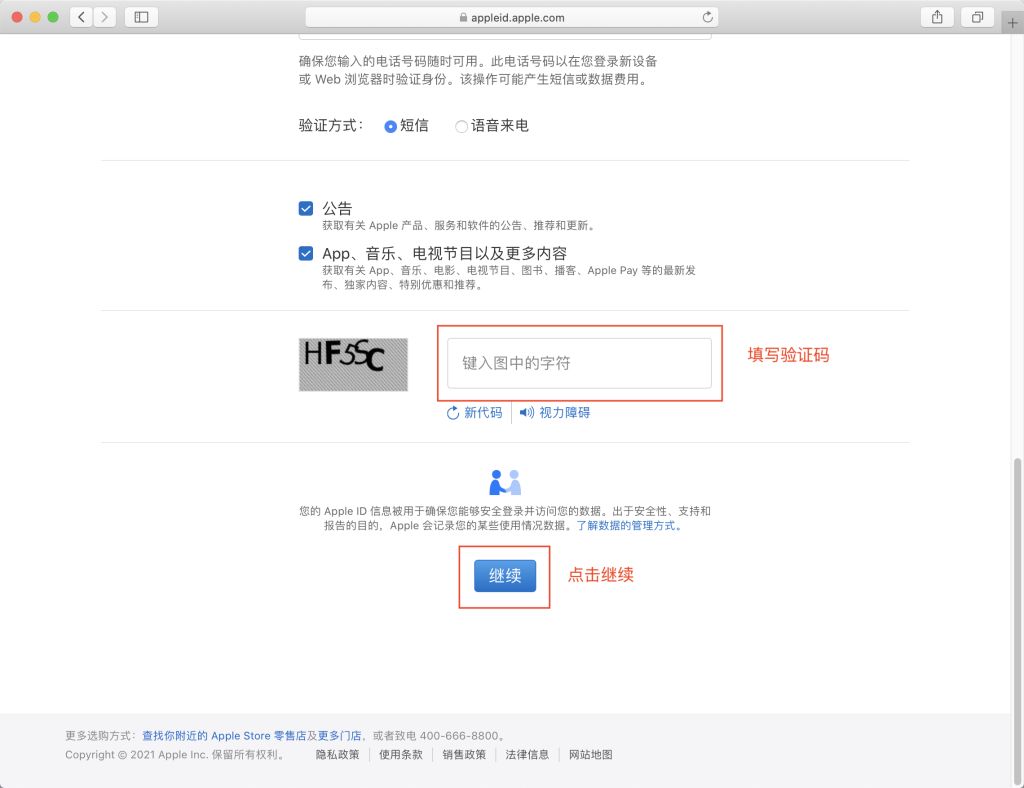 - 输入手机收到的短信验证码,点击”继续”