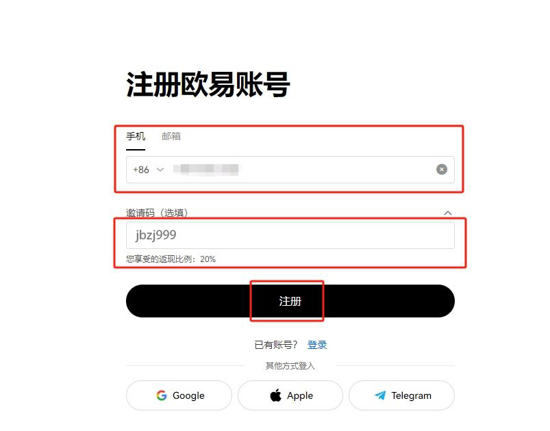 1、在进行交易之前,首先现需要进行账户注册,打开欧易欧易注册链接:https://static.jbzj.com/qkl/ok/zhuce.html,进入到注册页面。填写中国大陆手机号码,输入欧易邀请码jbzj999就能够享受百分之二十的返现比例(20%的手续费优惠),点击【注册】按钮。