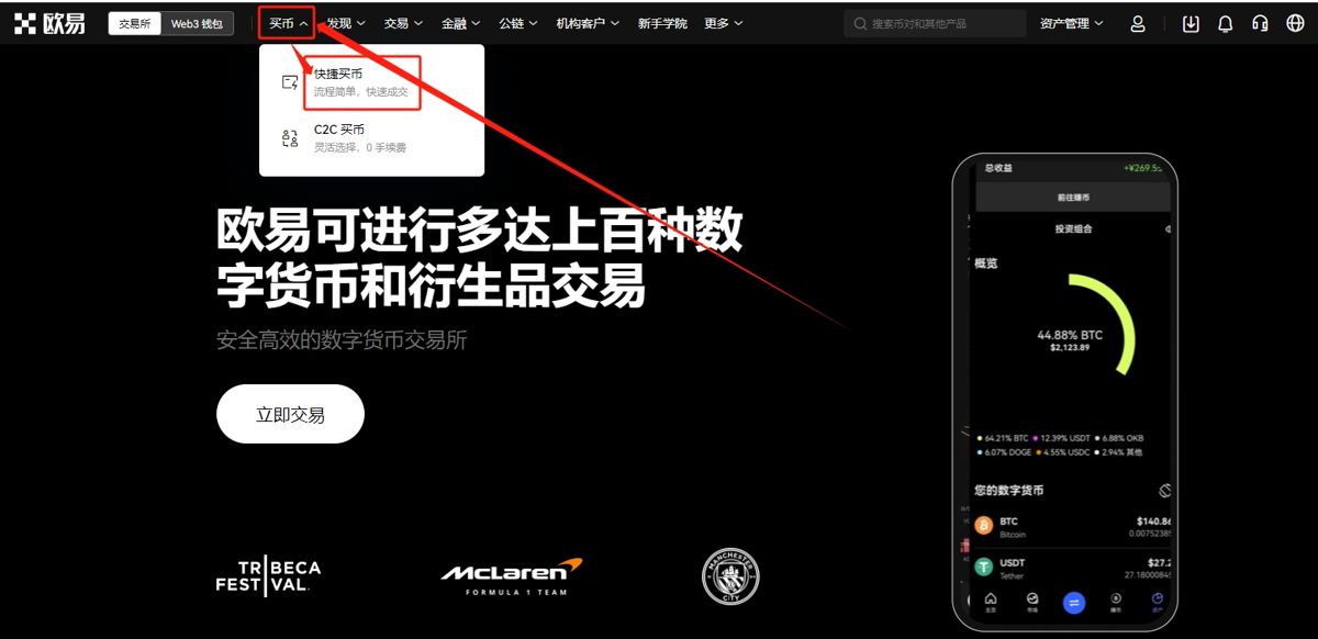 1、进入欧易交易所的首页,点击左上角的【买币】按钮,找到“快捷买币”。
