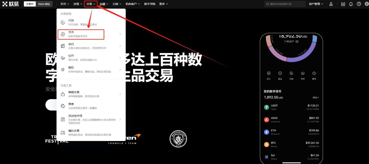 4、回到欧易首页,点击左上角【交易】按钮,点击“币币”,币币就是现货交易的意思。进入交易页面。