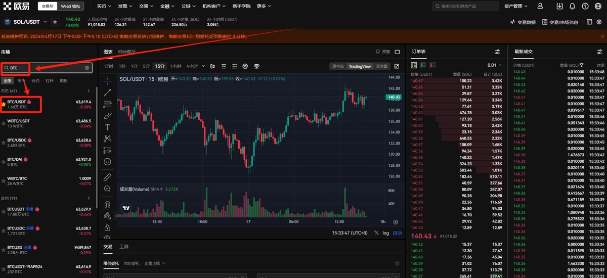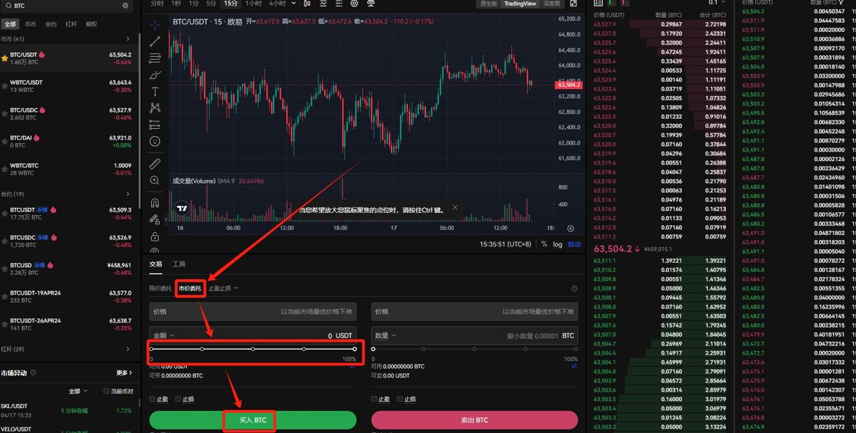 5、选择我们交易的币种,比如我我想去购买比特币,就可以在上方搜索“BTC”。选择“BTC/USDT”,意思就是我们使用USDT去兑换BTC。