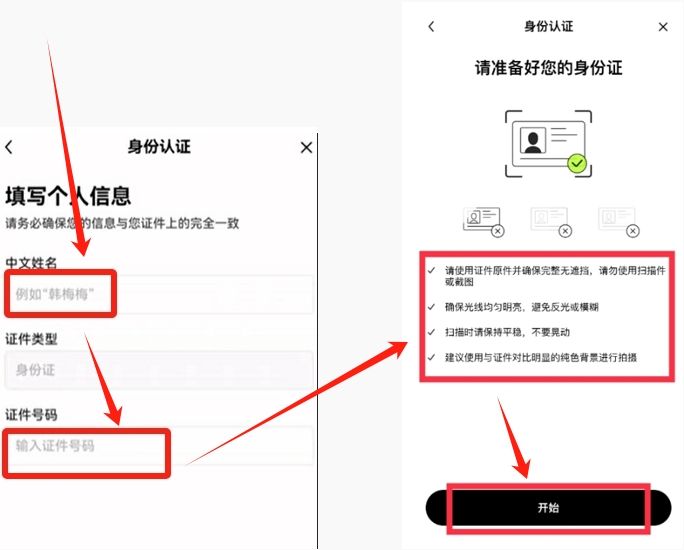 3、填写姓名,输入身份证号之后,,点击【开始】。根据页面要求上传身份证件的正反面照片。最后再进行一下人脸识别,等待验证通过就可以了。注意身份信息一定要如实填写,否则人脸识别这里不能通过。
