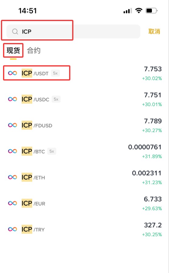 3、输入【ICP】,这时下拉会显示【现货】【ICP/ USDT】,点击【ICP/ USDT】。(作为新手,不建议做合约,所以这里就不演示合约购买方式了。)