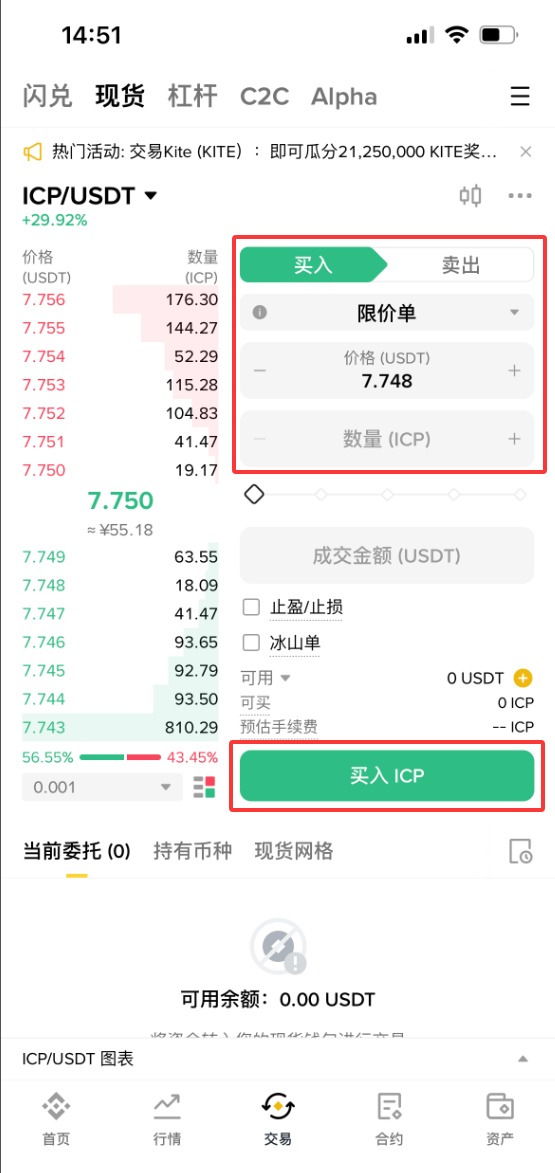 5、依次选择【限价单】-购买【价格】-购买【数量】-【成交数量】,设置好之后,点击【买入ICP】。