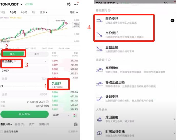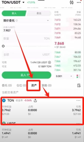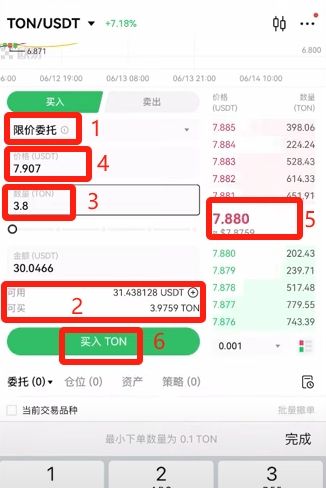我们现在就用限价委托试一下,这里可以看到我们可用的U是31点多个,可买是3.97个,我这里试一下买3.8个,我这里给的价格是7.907,而它的限价是7.881,所以我们买的话是可以马上成交的。点击买入TON,这样我们就买好了。