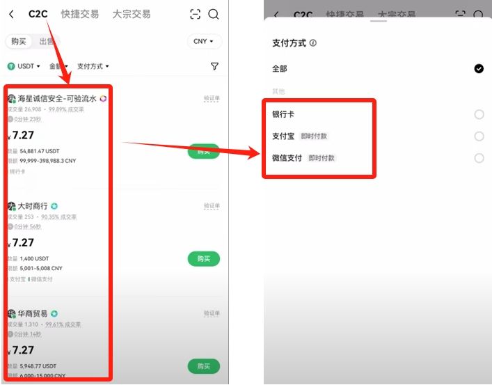 这里我们可以看到是有多少商家在卖U,他们卖的价格,他们卖的数量,还有他们限定额度。还有一个就是他们的付款方式,付款方式有三个主流一般是银行卡、支付宝和微信,建议大家选择银行卡或者是支付宝。