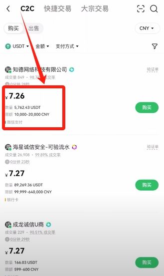 现在1U的价格是7.26人民币,这里可以看到有许多公司,他们是有在卖U的。他们限定的是每个人可以买多少数额,到多少数额人民币的U。