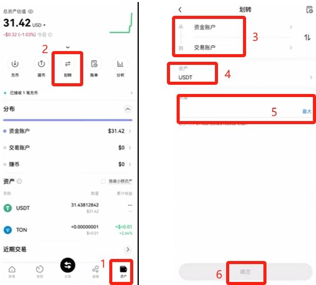 现在我们已经把我们的人民币换成了U,怎么样去买我们想要的币呢?首先我们买到的U是先放在了我们的资金账户,但是我们要去买的话,就先要把资金账户的钱,转到交易账户。我们点击右下角的资产,上方点击划转,我们把资金账户的钱转到交易账户,币种选择USDT,数量选择最大,点击确定。