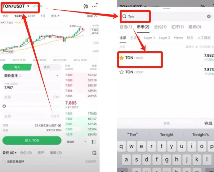 你要买什么币都可以在左上方这里进行选择。我们试一下买我比较看好的TOM,它是telegram的一条链,选择“TON/USDT”。