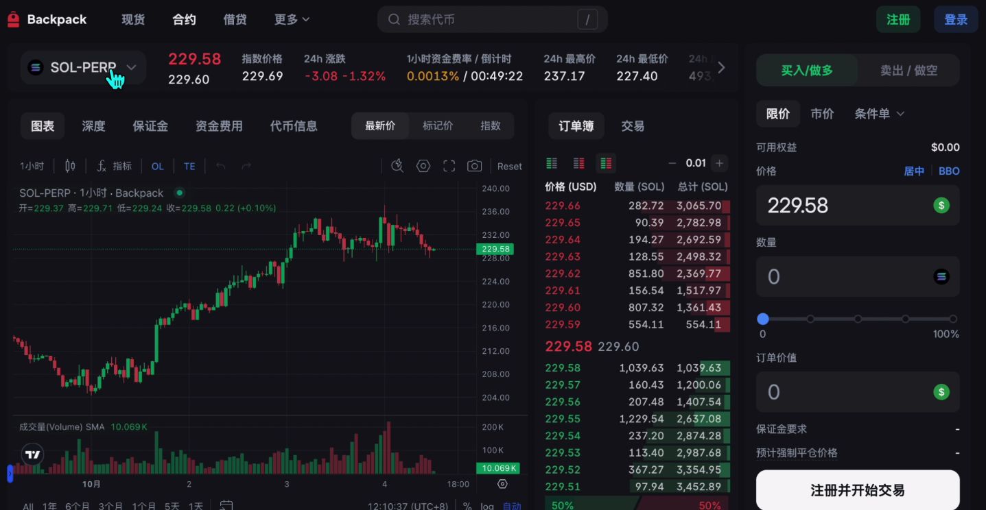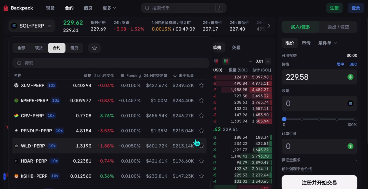 下面一个就是backpack交易所。backpack交易所原本是FTX的老班底,而这间交易所它的一个交易调性,整体的一个交易系统就是跟老的FTX是没有任何区别的。所以对于一些专业的交易者来说,你可以使用backpack交易所在这里去做交易,用起来还不错。