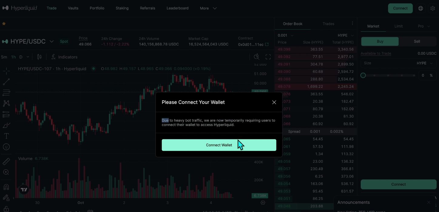 同时他还有一个特点就是不需要KYC,也就是不需要身份认证,只要你的钱包里面有钱,无论是OK的钱包或者是其他的什么钱包,连上了Hyper Liquid就能够去进行交易。而且他的成交量其实还挺大的,因为它是一个去中心化的交易所,所以在里面我们是能够看到每一笔真实存在的交易的,完全透明的。也就是说,哪一个钱包地址在Hyper Liquid里面开了多少币,是开多还是开空都是能够直接看的。这个跟其他平台相比,就是一个很大的优势,因为它是一个去中心化、链上完全透明的平台,如果你并不想在交易所里面去做KYC的认证,你就可以直接使用Hyper Liquid,这个链上的去中心化协议。