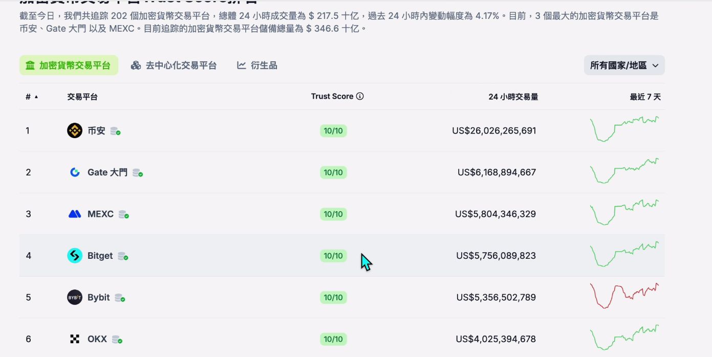 其次是Bitget交易所,Bitget交易所作为一个新兴的交易所,你可以把它理解为是OKX和币安的一个补充。Coingecko里面Bitget是排到了第四位的。
