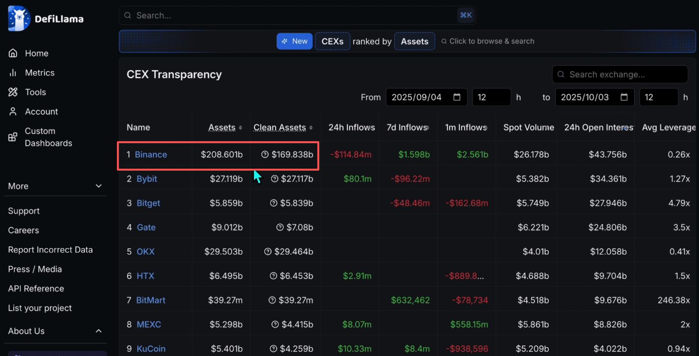 刚刚说的是交易量层面,除了交易量还有一个是资产沉淀层面,也就是这间交易所里面存了多少钱。我们来看排名第一的事币安binance,它的资金沉淀量2086亿美金。其他交易所跟币安完全是没得比的,完全就不是一个等级的。所以币安它的排名属于断档式的领先,这个是毋庸置疑的。